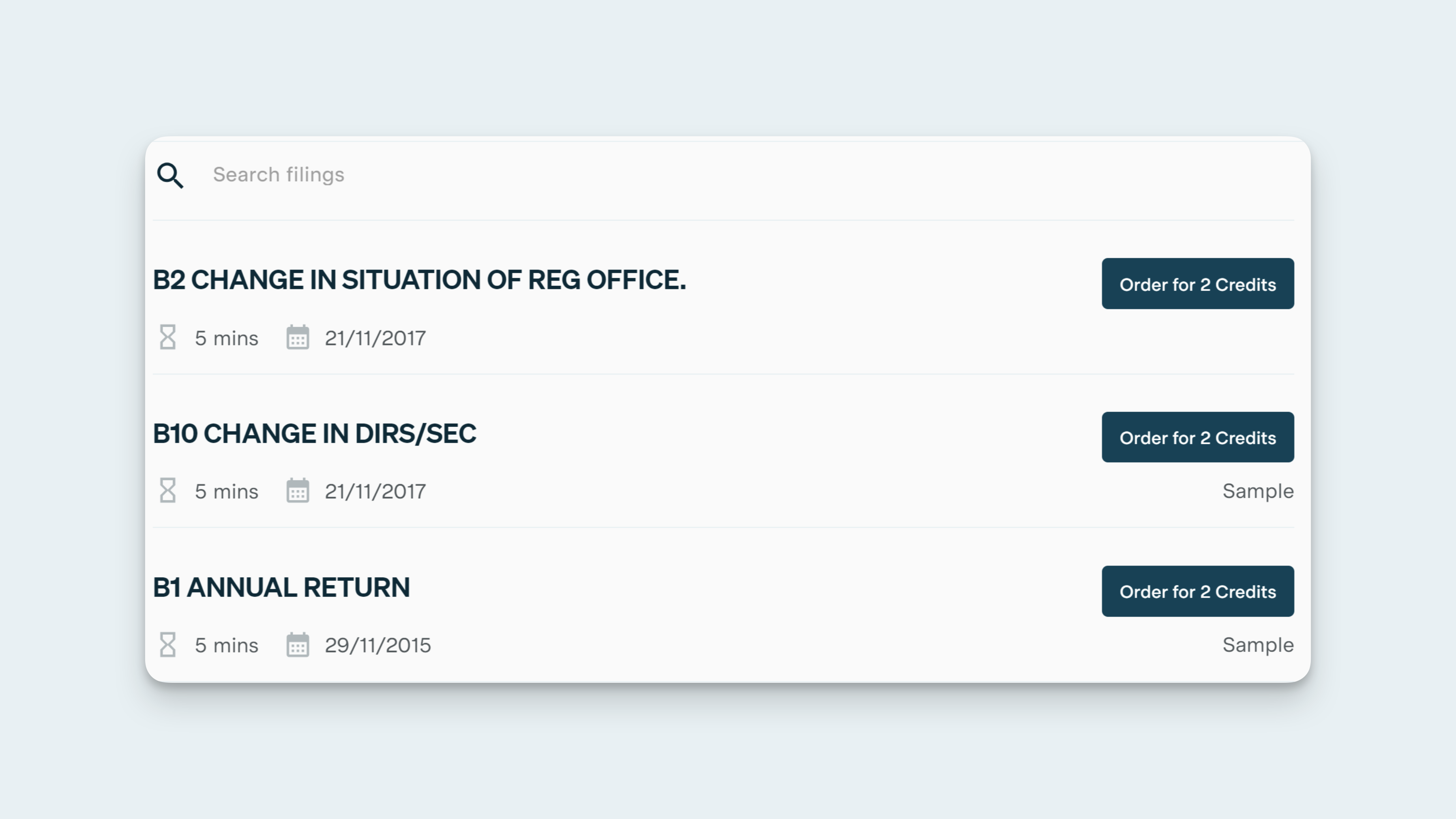 On the company profile page, you can find a list of documents that have been filed by the company. This list is located on the right side of the page and provides details such as the target delivery time (in minutes), charge in credits, and a sample document (where available). For more information on registry extracts, click here.